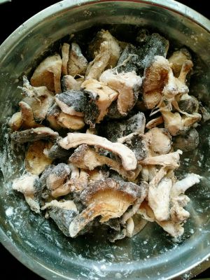 2个鸡蛋清打起泡,加入面粉搅拌至筷子提起来成直线。加入切好的香菇沾满面糊
