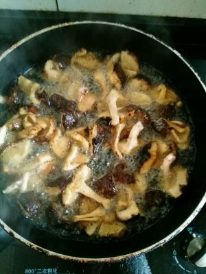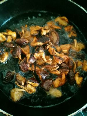 用小锅倒油加热至5、6成热,一个个放入香菇炸至金黄色捞出