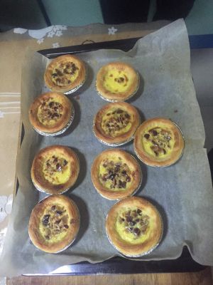 搅拌好后倒入解冻好的蛋挞皮中,7.8分满即可。根据个人爱好,还可放入葡萄干、蜜豆等