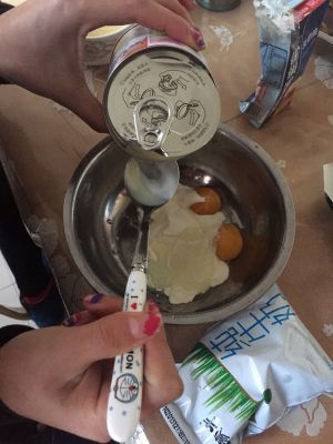 2.接着是倒入。俩勺炼奶。奶油和炼奶用的都是雀巢的