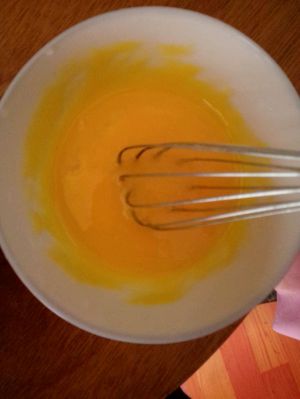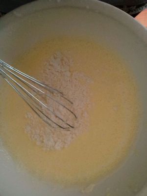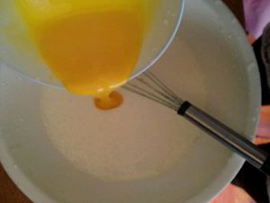 将蛋黄放入1中,低筋粉过筛放入,搅拌均匀,然后把拌好的液体再过筛一遍,蛋液做好!