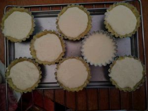 待蛋挞水凉后,将蛋挞水倒入蛋挞皮中(网购)。