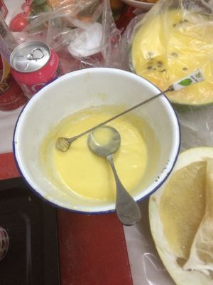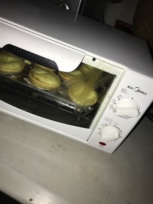嗯,前面的都忘记拍照了,嘿嘿,反正就是牛奶,加鸡蛋,在加低筋粉搅拌在一起咯,然后倒在蛋挞皮里面放烤箱烤25分钟就好了,哈