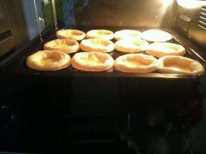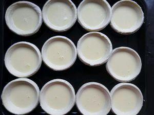将蛋挞胚放入烤盘,我的烤盘一次只能放入6枚蛋挞胚。