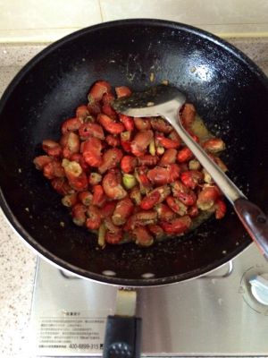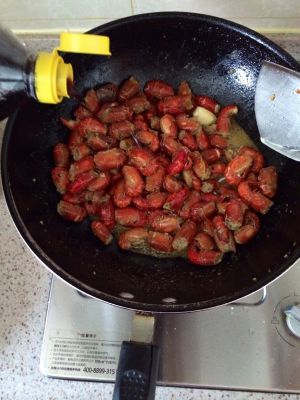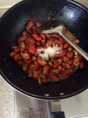 放入龙虾翻炒,加糖,酱油,盐,蚝油