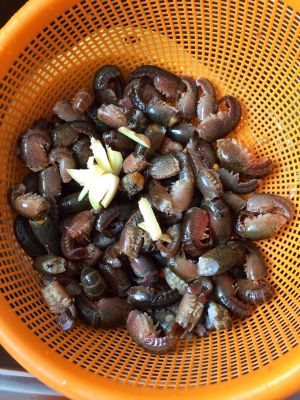 两斤龙虾,刷干净,切去一部分头,抽去尾部的肠子,水里浸泡一段时间。