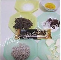 黑巧克力分成两份。其中30克切成黄豆大小的巧克力碎备用。剩下的100克切成块,黄油切成块,