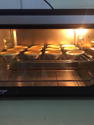 蛋挞水装百分之八十左右就可以了,放入烤箱,老乡加热180度五分钟,之后180度15分钟。看颜色。如果比较淡,调到150!蛋挞上面封皮了,稍焦一点就可以了!