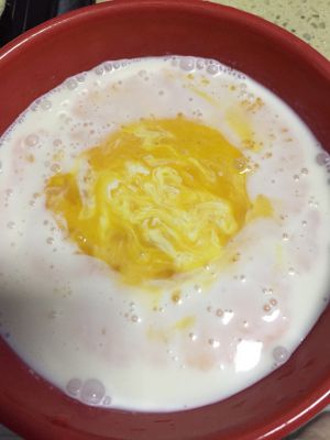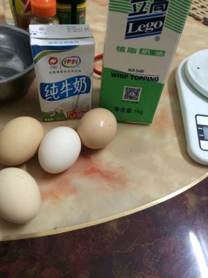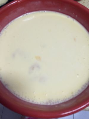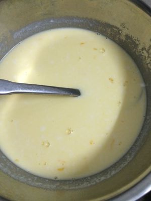 把糖和牛奶搅拌均匀,再加奶油搅拌均匀,鸡蛋打散,不用打发,加油盐所有材料搅拌一起。
