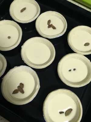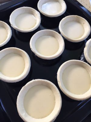 蛋挞皮放出备用,将蛋挞水放挞皮里,八分满…