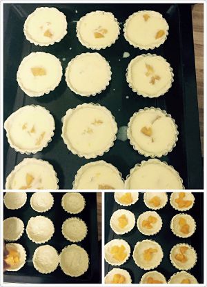 小面团入模备用,摆上黄桃。把蛋黄打匀加入牛奶,炼乳,糖,玉米淀粉拌匀,倒入蛋挞皮中