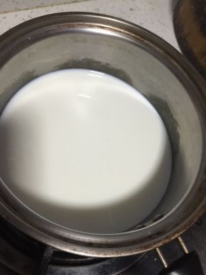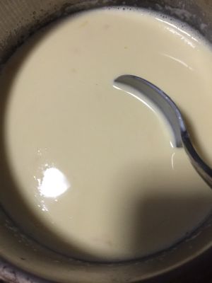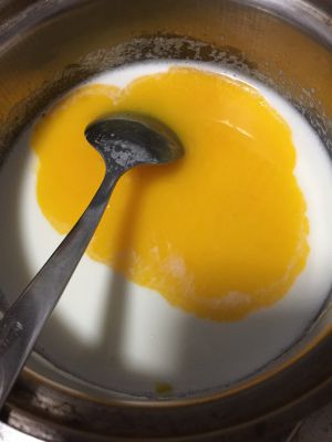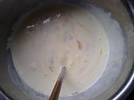 待牛奶晾凉后,倒入提前打散的蛋黄,搅匀均匀(预热烤箱220度)