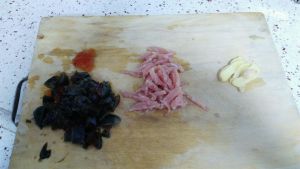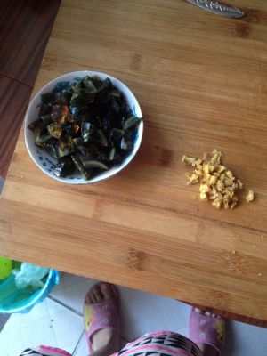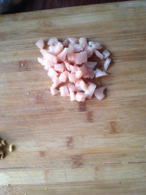 将煮熟的肉切成小肉粒,皮蛋切成小块(皮蛋不太好切,我以前每次切都弄得乱糟糟的,切好的蛋总会粘成一团,现在发现把蛋黄和蛋清分开切会比较容易些)。姜切成小细末,越细越好,放姜主要是起到去腥的做用。小葱将葱白和葱叶分开切,分开放。