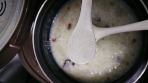 在米里放入肉粒,盐,少量白糖,鸡精,我比较喜欢黑胡椒的味道,所以又放了些黑胡椒,电饭煲开启煮粥模式,煮二十分钟后放入皮蛋,再继续煮十分钟,将葱叶放入粥内,搅匀,然后关火