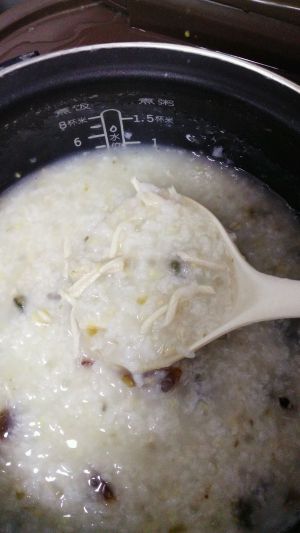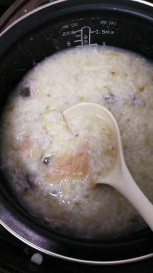 电饭锅里加水烧开,煮粥30分钟,之后放入皮蛋,香肠丁个大半葱花,姜丝,继续煮10分钟,如果喜欢咸一些可以加少许盐,(特别提示我在煮粥的时候放了鸡精,如果总瘦肉的话要提前加料酒和盐腌制10分钟)感觉加鸡精味道很好,个人建议