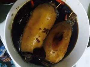 填米和桂花。填的时候才知道这菜没那么好弄,填米这活需要耐心和细心。将糯米和一份桂花混合,一起填入藕里,边填边用筷子塞实。填完后,将切下来的部分,用牙签固定还原成一个整藕。