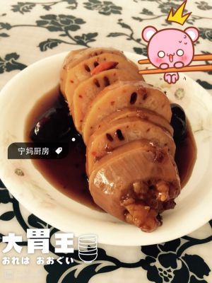 糯米泡俩小时,莲藕洗净,去皮。切去一头,把泡好的糯米塞进孔。用筷子捅实。然后把切去的头用牙签塞住,换另一个头同样的做法,一般一个头用四个牙签。放进水里煮,把配件都加进去!煮中火半小时,大火一个半小时。捞出,放进碗里,汁根据自己口味添加甜度。大火稍微收汁,然后同藕一起放入碗中,盖保鲜膜,冷藏一夜切开食用,