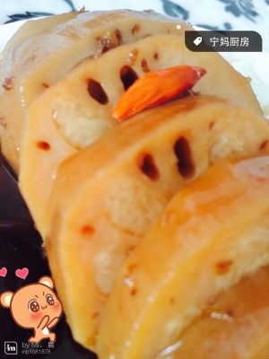 成品,我还略微放了一些枸杞,还有红枣,最后冷藏的时候,藕上另外加了一些桂花糖。
