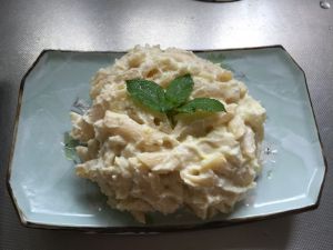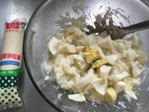 加鸡蛋 盐 胡椒粉 色拉酱 空心粉拌匀