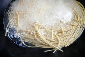 咸蛋黄压碎放入锅中,再倒入葱花一起翻炒,盖上盖子焖一分钟转微火;