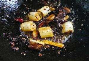 另起一锅倒入一小勺油,烧热后倒入葱、姜、蒜、干辣椒、花椒爆香,然后加入豆豉翻炒;