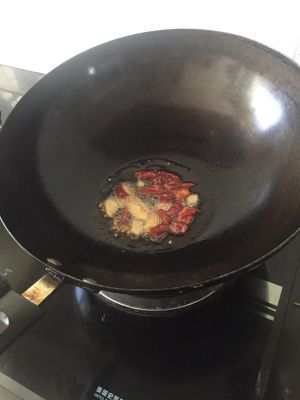 锅里四勺油烧热,先下姜丝爆香,再下蒜蓉煸炒出香味。