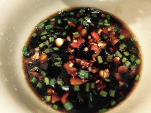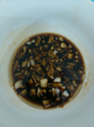 盐,酱油,香油,陈醋,蒜泥调好。