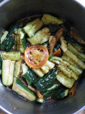 把煮开的酱汁淋入黄瓜中;放冰箱冷藏1小时后取出食用;