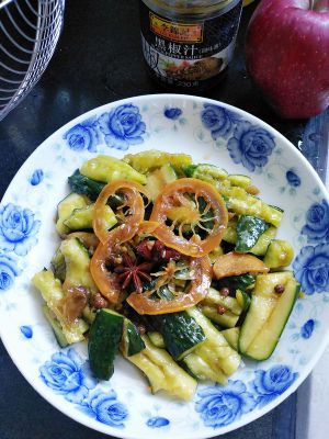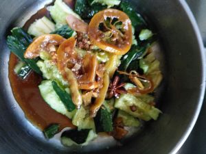 加入小米椒,八角,花椒,柠檬片,适量醋,麻油,酱油