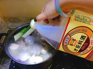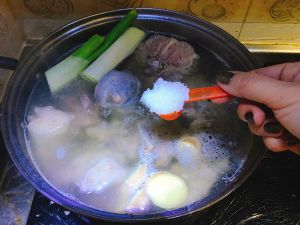 锅里放清水,开始炖羊蝎子,加入花椒、葱姜蒜、陈皮、老抽各适量,加入红太阳火锅汤料小火炖煮至少一个半小时,我家有老人,我就炖制2个小时,快炖熟了,加适量盐。