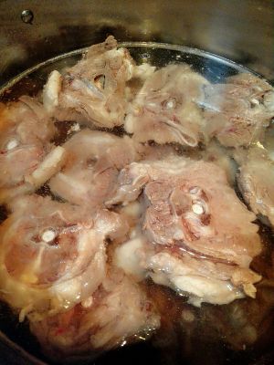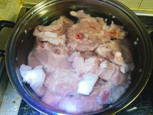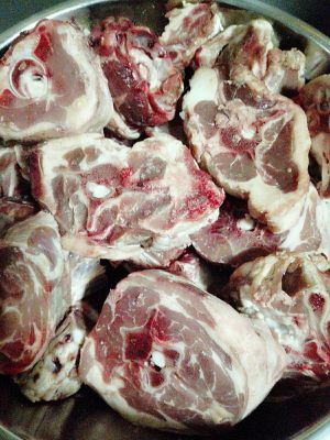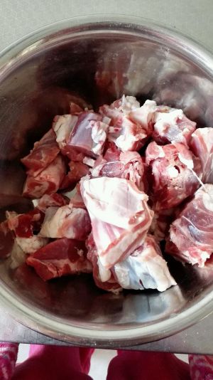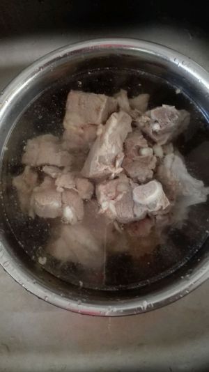羊蝎子泡进清水里,去除血水,反复换水,至少一个小时。