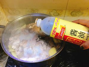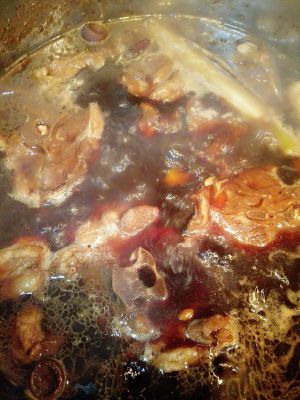 羊蝎子炖到8成熟时加入酱油(如果想颜色深一些,可以再加入一些老抽)