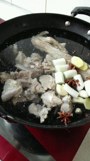 羊蝎子洗净冷水浸泡40分钟,焯水洗净