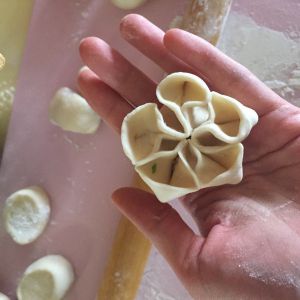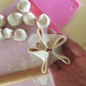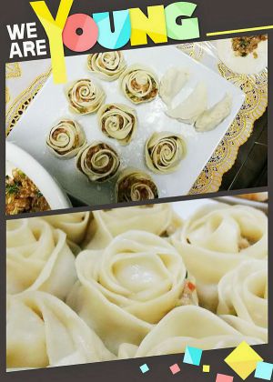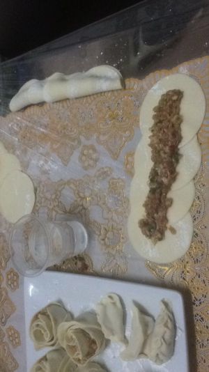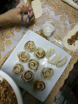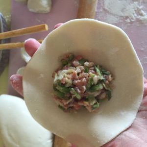 拌肉陷,后腿肉,肥瘦3:7的样子剁碎,我是在家乐福让师傅用机器打碎回来的,放葱花,生姜末少许,盐一勺,生抽两勺,老抽半勺,耗油一勺,蛋清一个,植物油四勺(油可以多点),顺时针搅拌。 开始包花,四个饺子重叠排开,放肉馅,少一点陷,不然会爆开。