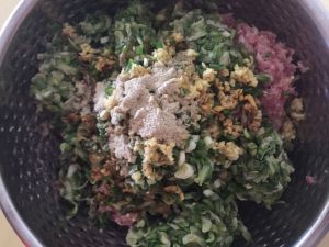 槐花飞水挤干水和肉末 葱花 姜末 胡椒粉 麻油盐搅拌均匀