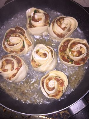 放少量油炸至花饺下面变黄,放少量水,盖上锅盖。