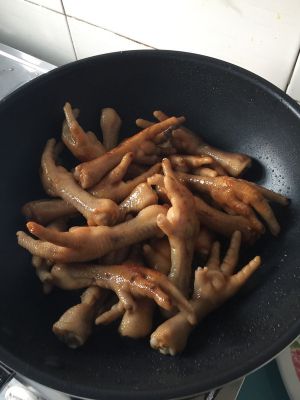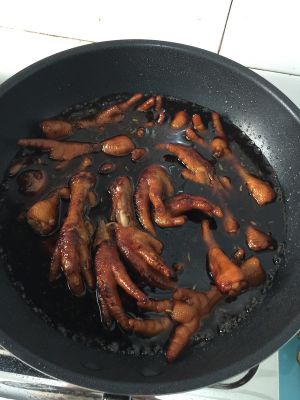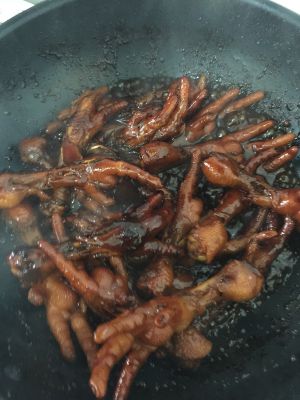 鸡爪上色,倒入刚调好的,料酒、老抽、生抽
