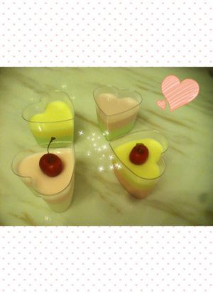 第一层凝固后可以再上第二层凝固后还可以上第三层第四层,这样彩虹布丁就成功了,还可以加上水果点缀