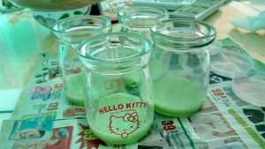 把融化的QQ糖和牛奶一起搅呀搅。牛奶的用量看你最后容器的大小(我放了大约3、4钱的酒樽一杯)