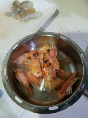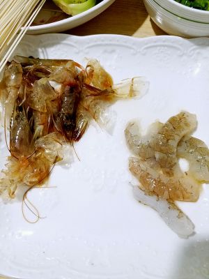 虾去头去尾去壳,挑去黑线,取出虾仁,虾壳保留。