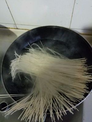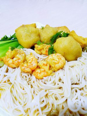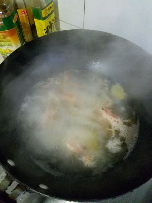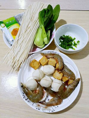 水烧开后先倒入咖喱粉,再加入葱段,鱼蛋,豆腐果,虾仁。加入适量盐和冰糖,大火继续焖煮5分钟。