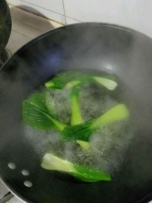 另起一锅,烧至水开后,放入白菜焯一遍夹出放在面条上。