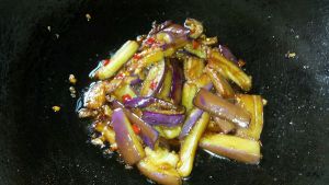把蒜泥炒香,把酱油倒下去。茄子也一起下去。熟了就可以起锅咯。