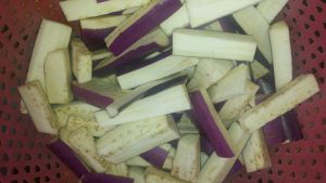 放菜油下锅,等滚就把茄子放下炸。茄子变成金黄色捞起来。