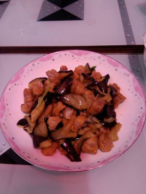 锅内留底油葱花,蒜片爆锅,下肉段快速翻炒加入茄子,放盐出锅。