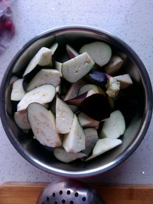 紫茄子洗净切滚刀块,冲一下水,控水备用