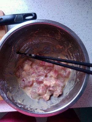 猪肉切段加入鸡蛋,盐,淀粉抓匀。