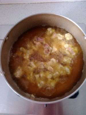 猪肉段放入热油中炸两遍,茄子炸金黄色。