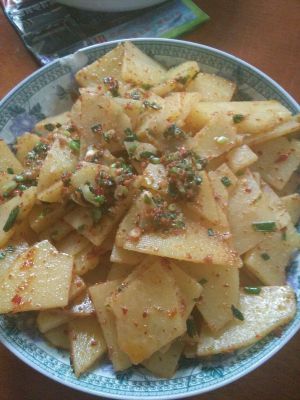 然后锅里放油,适量,油热后把切好的土豆放到锅里炒一下