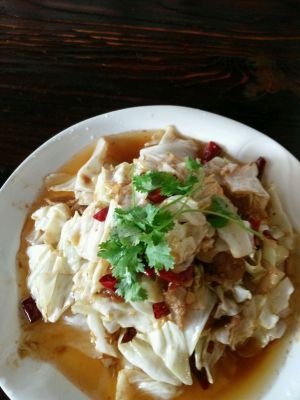 锅里留油,五花肉炒干放生姜大蒜辣椒段耗油炒香,加入包菜放盐鸡精味精糖蒸鱼豉油水翻炒20秒左右